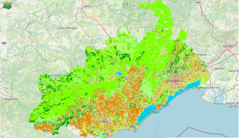 The Shapefile of land use in the Hérault department in 2015 maps the distribution of different land use classes, such as urban, agricultural, forest, and wetland areas.
